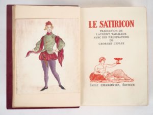PÉTRONE. LE SATIRICON. Traduction de Laurent Tailhade. P., Chamontin, 1941. In-8 chagrin grenat, dos à nerfs orné, titre doré, couverture conservée (Reliure de l’époque). ÉDITION ILLUSTRÉE de 10 COMPOSITIONS h.-t. coloriées au pochoir de Georges LEPAPE. Tirage limité à 3350 exemplaires. UN des 225 du tirage de tête numérotés sur vélin d’Arches contenant une EAU-FORTE couleurs.
