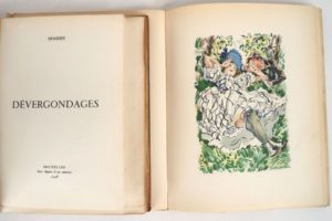 [ROJAN]. SPADDY [Pseudonyme de Johannes GROS]. DÉVERGONDAGES. Bruxelles [Nice], Aux dépens d’un amateur, 1948. In-4 ½ basane fauve à coins, dos lisse, pièce de titre (Reliure de l’époque). Petit manque à la coiffe supérieure, épidermures, trace brune à la 1ère charnière intérieure, une illustration détachée. ÉDITION HORS-COMMERCE ILLUSTRÉE de 15/16 reproductions lithographiques libres en couleurs d’après des aquarelles de Feodor Rojankowski, dit ROJAN. Tirage limité à 250 exemplaires. UN des 234 numérotés sur vélin de Rives. ¶ Dutel, 1389 – Pia, 329 – BÉRANGER (P.-J.). CHANSONS GALANTES. P., Éd. de la belle Étoile, 1937. In-4 broché. ÉDITION ILLUSTRÉE de 16 COMPOSITIONS en couleurs d’après les aquarelles de ROJAN. Tirage limité à 1516 exemplaires. UN des 1500 numérotés sur vélin Navarre. ENSEMBLE DE 2 OUVRAGES.