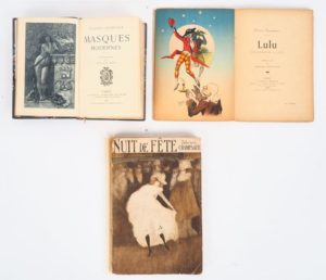 [ROPS]. CHAMPSAUR (F.). MASQUES MODERNES. P., Dentu, 1889. In-12 ½ maroquin vert kaki, dos à nerfs orné en queue d’un monogramme « J. C. » doré, date en queue, titre doré, tête dorée, plats de la couverture conservés (Franz). Ex-libris « M. H. Hocquette ». ÉDITION ORIGINALE. Frontispice à l’EAU-FORTE de Félicien ROPS en 3 états (noir, couleurs, bleu). 1er plat de la couverture illustrée en couleurs de José ROY en 2 états. UN des 30 EXEMPLAIRES numérotés sur Japon Impérial, seul tirage en grand papier, avec la signature autographe de l’auteur – CHAMPSAUR (F.). LULU. Pantomime en un acte. P., Dentu, 1888. Plaquette in-8 brochée. Petits frottements et manques à la couverture. ÉDITION ORIGINALE. Mention fictive de « 6me édition ». Couverture et frontispice couleurs de Jules CHÉRET, dessins couleurs à pleine page et dans le texte de Louis MORIN et Henry Gerbault – CHAMPSAUR (F.). NUIT DE FÊTE. P., Offensatdt frères, [1902]. Grand in-8 broché. Dos recollé. ÉDITION ORIGINALE. Elle contient 75 ILLUSTRATIONS en noir et aquarellées au pochoir de Georges Bottini (qui a également réalisée la couverture), Auguste François-Marie Gorguet et Charle Lucas. ENSEMBLE DE 3 OUVRAGES.