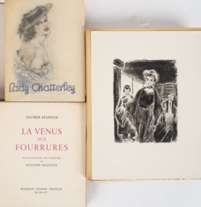 SACHER-MASOCH (L. von). LA VÉNUS AUX FOURRURES. P., Gonon, 1954. In-4 en ff., chemise et étui (salissures au dos de la chemise). ÉDITION ILLUSTRÉE de 12 COMPOSITIONS couleurs à pleine page de Suzanne BALLIVET. Tirage limité à 992 exemplaires. UN des 750 numérotés sur vélin chiffon de Lana – LAWRENCE (D. H.). LADY CHATTERLEY. Deux-Rives, 1950. Fort volume in-4 en ff., chemise et étui (défraichi). ÉDITION ILLUSTRÉE de 17 LITHOGRAPHIES couleurs h.-t. de CHIMOT. Tirage limité à 1025 exemplaires. UN des 100 numérotés sur vélin BFK de Rives à la cuve contenant une POINTE-SÈCHE originale et une SUITE en noir des illustrations – MIRBEAU (O.). LE JARDIN DES SUPPLICES. Monaco, Documents d’Art, 1945. Fort volume grand in-4 en ff., chemise et étui. ÉDITION ILLUSTRÉE de 24 EAUX-FORTES en noir h.-t. et dans le texte de Pierre LEROY. Tirage limité à 540 exemplaires numérotés sur vélin pur fil Johannot à la forme. ENSEMBLE DE 3 OUVRAGES.