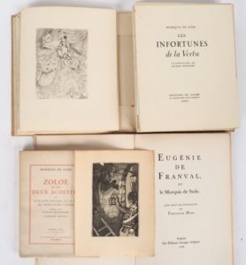 [SADE]. SADE (Marquis de). ZOLOÉ ET SES DEUX ACOLYTES ou Quelques décades de la vie de trois jolies femmes. P., Éditions d’Art de l’Intermédiaire du Bibliophile, 1928. In-8 broché. ÉDITION ILLUSTRÉE d’une SUITE libre tirée en noir de 6 POINTES-SÈCHES de Léon COURBOULEIX. Tirage limité à 775 exemplaires. UN des 750 numérotés sur Annam de Rives. ¶ Pas dans Pia ni Dutel – EUGÉNIE DE FRANVAL. P., G. Artigues, 1948. Grand in-8 broché. ÉDITION ILLUSTRÉE de 8 POINTES-SÈCHES de Valentine HUGO, reproduites en phototypie. Tirage limité à 1200 exemplaires numérotés sur vélin de Lana – LES INFORTUNES DE LA VERTU. P., Éd. du Globe, [1947]. In-4 en ff., chemise et étui (défraichis), pointes de rousseurs sur les tranches. ÉDITION ILLUSTRÉE de 21 LITHOGRAPHIES et lettrines de Lilian GOURARI. Tirage limité à 300 exemplaires numérotés sur vélin teinté Johannot. ¶ Pia, 462. ENSEMBLE DE 3 OUVRAGES.