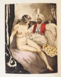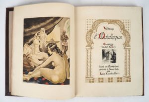VOLTAIRE. L’ODALISQUE. Ouvrage traduit du turc. S.l., imprimé sur la presse à bras de l’artiste, [vers 1930-40]. Grand in-4 basane havane, dos muet orné de nerfs en torsade, doublures et gardes de daim beige, couverture conservée (Reliure de l’époque). ÉDITION ILLUSTRÉE de 10 EAUX-FORTES ÉROTIQUES h.-t. en couleurs et de dessins en noir dans le texte de Léon COURBOULEIX. Texte gravé en rouge et noir avec encadrements décorés. Tirage limité à 350 exemplaires. UN des 279 numérotés sur vélin d’Arches avec la signature autographe de l’artiste.