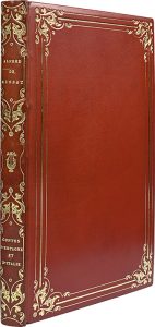 tranches dorées sur témoins, jeu de filets dorés intérieur, doublures et gardes de moire bleu ciel, couverture, étui bordé (G. Mercier, succ. de son père, 1924).