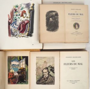 BAUDELAIRE (Ch.). LES FLEURS DU MAL. P., Éd. de la Maison Française, 1947. Grand in-4 en ff. sous chemise et étui. ÉDITION ILLUSTRÉE de bois couleurs d’après DIGNIMONT. Tirage limité à 800 exemplaires sur pur chiffon Corvol. Un des 300 numérotés en chiffres romains – BAUDELAIRE (Ch.). LES FLEURS DU MAL. P., Ferroud, 1917. In-8 vélin ivoire à petits rabats, titre calligraphié au 1er plat, dos lisse muet, couverture conservée (Reliure de l’époque). ÉDITION ILLUSTRÉE de bois en noir d’après G. ROCHEGROSSE – BAUDELAIRE (Ch.). LES FLEURS DU MAL. P., Éditions du Trianon, 1930. In-4 broché. ÉDITION ILLUSTRÉE de 8 reproductions au pochoir d’aquarelles h.-t. d’EDY-LEGRAND. Tirage limité à 650 exemplaires. Un des 600 numérotés sur vélin de Rives. E.A.S. sur le 1er f. blanc : « Edy-Legrand / 23 sept 38 / Pour Marot, avec ma fraternelle affection » – BAUDELAIRE (Ch.). LES FLEURS DU MAL. P., La Belle Édition, sans date [vers 1950]. Petit in-4 broché. ÉDITION ILLUSTRÉE de 14 COMPOSITIONS couleurs de CHIMOT. Un des 3500 exemplaires numérotés sur vélin de Lana. ENSEMBLE DE 4 OUVRAGES.