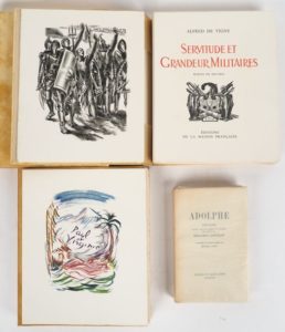 BERNARDIN DE SAINT-PIERRE. PAUL ET VIRGINIE. Éditions de la Maison Française, 1947. Grand in-4 en ff., chemise et étui. ÉDITION ILLUSTRÉE de nombreuses COMPOSITIONS d’E. Othon FRIESZ, gravées sur bois en couleurs par Gérard Angiolini. Tirage limité à 800 exemplaires numérotés sur pur chiffon de Corvol l’orgueilleux. Un des 300 réservés aux États-Unis et à l’étranger – VIGNY (Alfred de). SERVITUDE ET GRANDEUR MILITAIRES. Éditions de la Maison Française, 1947. Grand in-4 en ff., chemise et étui. ÉDITION ILLUSTRÉE de 12 h.-t. et une couverture gravés au burin par DECARIS. Titre, 7 têtes de chapitre et lettrines dessinés par Decaris et gravés sur bois par Gérard Angiolini. Tirage limité à 800 exemplaires numérotés sur pur chiffon de Corvol l’orgueilleux. Un des 300 réservés aux États-Unis et à l’étranger – CONSTANT (B.). ADOLPHE. Lausanne, Éditions du Grand-Chêne, 1950. In-8 broché. ÉDITION ILLUSTRÉE de 21 COMPOSITIONS originales gravées à l’eau-forte par Michel CIRY. Tirage limité à 275 exemplaires. Un des 260 numérotés sur Rives à la forme. ENSEMBLE DE 3 OUVRAGES.