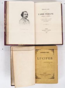 FABRE (F.). L’ABBÉ TIGRANE candidat à la papauté. P., Conquet, 1890. In-8 ½ maroquin grenat à coins, dos à nerfs orné, titre doré, date en queue, tête dorée, couverture conservée (V. Champs). ÉDITION ILLUSTRÉE d’un portrait et 20 EAUX-FORTES originales de E. RUDAUX. Tirage limité à 500 EXEMPLAIRES. UN des 350 numérotés sur vélin du Marais contenant un ÉTAT supplémentaire du portrait et des eaux-fortes avant la lettre. MOT AUTOGRAPHE (2 pp.) signé de F. Fabre monté sur onglet en tête du volume – FABRE (F.). LUCIFER. P., Charpentier, 1884. In-12 Bradel ½ percaline vert amande, dos lisse orné de fleurons et filets dorés, pièce de titre, date en queue, tête dorée, plats de la couverture conservés (Reliure de l’époque). ÉDITION ORIGINALE. E.A.S. de l’auteur sur le f. de faux-titre. ENSEMBLE DE 2 OUVRAGES.
