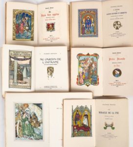 [FERROUD]. ENSEMBLE DE 10 OUVRAGES ILLUSTRÉS DE L’ÉDITEUR FERROUD. 11 volumes brochés, in-8 ou in-12. SAMAIN (A.). XANTHIS ou La Vitrine sentimentale. 1920. In-8. Couverture en partie légèrement ombrée. Compositions au pochoir de G. A. MOSSA. UN des 775 numérotés sur vélin d’Arches – SAMAIN (A.). AU JARDIN DE L’INFANTE suivi de plusieurs poèmes. 1920. In-8. Bois gravés en couleurs d’A. GIRALDON. UN des 800 numérotés sur vélin d’Arches – MUSSET (A. de). LES NUITS. 1922. In-8. FRONTISPICE gravé au vernis mou, bandeaux, culs-de-lampe et fleurons de W. FEL. Tirage de luxe limité à 125 exemplaires. UN des 75 numérotés sur Japon impérial avec 2 ÉTATS du frontispice – MUSSET (A. de). ROLLA. 1912. In-8. Petite tache au 1er plat. FRONTISPICE gravé à l’eau-forte, ornements de L. LEBÈGUE. UN des 865 numérotés sur vélin d’Arches – GEBHART (É.). LE ROI DAGOBERT. 1911. In-8. Gravures à l’eau-forte par L. LEBÈGUE et de lettrines et ornements or et couleurs. Tirage limité à 300 exemplaires. UN des 190 numérotés sur Hollande – FRANCE (A.). LA LEÇON BIEN APPRISE. 1922. In-12. Compositions au pochoir de G. A. MOSSA. UN des 1200 numérotés sur vélin teinté d’Arches – FRANCE (A.). LA LÉGENDE DES SAINTES OLIVERIE ET LIBERETTE. 1924. In-12. Petites taches brunes en marge inférieure de 8 pp. Compositions au pochoir de G. A. MOSSA. UN des 1200 numérotés sur vélin teinté d’Arches – FRANCE (A.). LE MIRACLE DE LA PIE. 1921. In-12. Compositions au pochoir de Maurice LALAU. UN des 1200 numérotés sur vélin teinté d’Arches – FRANCE (A.). FRÈRE JOCONDE. 1923. In-12. Compositions au pochoir de Léon LEBÈGUE. UN des 1200 numérotés sur vélin teinté d’Arches – SAMAIN (A.). LE CHARIOT D’OR. 1926. In-8. Lithographies couleurs de Maurice LALAU. UN des 800 numérotés sur vélin d’Arches.