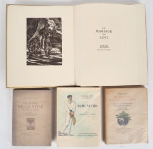 [LOTI (Pierre)]. LE MARIAGE DE LOTI. P., Éditions Littéraires de France, 1944. Grand in-4 en ff., chemise et étui de l’éditeur. ÉDITION ILLUSTRÉE de nombreux BOIS gravés en noir de Jacques BOULLAIRE, excepté celui de la couverture en couleurs. Tirage limité à 400 exemplaires numérotés sur vélin teinté pur chiffon des papeteries Rénage – LE CHÂTEAU DE LA BELLE AU BOIS DORMANT suivi de Le Gai pèlerinage de Saint-Martial. P., Ferroud, 1930. Petit in-8 broché. ÉDITION ILLUSTRÉE de BOIS en noir et couleurs de FRED-MONEY. Tirage limité à 1525 exemplaires. UN des 70 numérotés sur Japon impérial contenant une SUITE des bois en noir et une SUITE en 2 états (noir et couleurs) des bois en couleurs – RAMUNTCHO. P., Cyral, 1930. In-8 broché. ÉDITION ILLUSTRÉE de 60 COMPOSITIONS coloriées au pochoir de J.-P. TILLAC. UN des 965 exemplaires numérotés sur vélin de Rives – LE LIVRE DE LA PITIÉ ET DE LA MORT. P., Crès, 1922. In-8 broché. Rousseurs. ÉDITION ILLUSTRÉE de 50 BOIS couleurs par M. de BECQUE. UN des 1900 exemplaires numérotés sur Rives. ENSEMBLE DE 4 OUVRAGES.