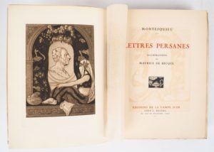 MONTESQUIEU. LETTRES PERSANES. P., Éditions de la Lampe d’Or. In-4 broché. ÉDITION ILLUSTRÉE 30 EAUX-FORTES monochromes de Maurice de BECQUE, dont 14 planches h.-t. Tirage limité à 1330 exemplaires. UN des 125 numérotés sur papier de Rives.