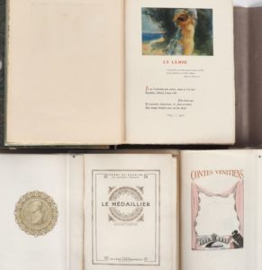 [RÉGNIER]. RÉGNIER (H. de). LE MÉDAILLIER. P., Le Livre Contemporain, 1923. In-8 en ff., chemise et étui de l’éditeur. Ex-libris collé sur l’étui. ÉDITION ILLUSTRÉE de BOIS gravés en couleurs d’Adolphe GIRALDON : 57 médaillons et 10 encadrements de page. Tirage unique limité à 118 exemplaires numérotés sur vélin d’Arches (pas de feuillet de justification de tirage) – RÉGNIER (H. de). CONTES VÉNITIENS. P., Le Livr, Chamontin, 1927. Grand in-8 broché. ÉDITION ILLUSTRÉE de 12 AQUARELLES de Charles MARTIN reproduites au pochoir par J. Saudé. Tirage limité à 530 exemplaires. UN des 450 numérotés sur vélin d’Arches à la forme – RÉGNIER (H. de). LA SANDALE AILÉE. P., Société des Amis du Livre, 1914. Fort volume in-4 broché, chemise à rabats et étui de l’éditeur (1 plat de la chemise détaché). ÉDITION ILLUSTRÉE réalisée sous la direction artistique de Charles MEUNIER et Léon Thévenin. 19 COMPOSITIONS en couleurs en 2 états (10 h.-t. et 9 dans le texte) par Antoine CALBET, nombreux en-tête et culs-de-lampe en bistre et en sépia. Tirage strictement limité à 150 exemplaires numérotés. UN des 125 réservés aux Membres de la Société sur beau vélin à la forme, celui-ci imprimé pour Monsieur Frédéric Raisin. ENSEMBLE DE 3 OUVRAGES.
