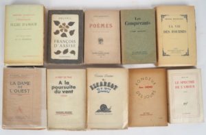 [LITTÉRATURE]. ENSEMBLE DE 10 OUVRAGES. - BENOIT (P.). LA DAME DE L’OUEST. (1936). ÉO. Un des 25 Japon. - CAU (J.). LE SPECTRE DE L’AMOUR. (1968). ÉO. E.A.S. à Jeanine et Raymond Queneau. - DELTEIL (J.). FRANÇOIS D’ASSISE. (1960). ÉO. E.A.S. - DERÈME (T.). L’ESCARGOT BLEU. (1936). ÉO. Un des 52 Rives. - GIONO (J.). RONDEUR DES JOURS. (1936). Mention de « 17e édition ». - MALRAUX (A.). LES CONQUÉRANTS. (1928). ÉO. Un des 3650 Alfa. - MARDRUS (Dr J.-C.). HISTOIRE CHARMANTE DE L’ADOLESCENTE SUCRE D’AMOUR. (1932). Un des 16 Rives. - MAETERLINCK (M.). LA VIE DES FOURMIS. (1930). Rousseurs éparses. ÉO. Un des 600 Hollande, à toutes marges. - SUPERVIELLE (J.). POÈMES. (1919). ÉO. - TRAZ (Robert de.). À LA POURSUITE DU VENT. (1932). ÉO. Un des 16 pur fil, celui-ci non numéroté.