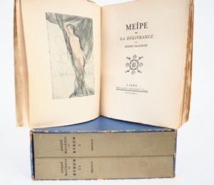 MAUROIS (André). MEÏPE ou LA DÉLIVRANCE. Paris, Grasset, 1926. In-4 broché, non coupé. ÉDITION ORIGINALE. UN des 295 EXEMPLAIRES numérotés sur vélin pur fil Lafuma, réimposés au format in-4 Tellière. FRONTISPICE à l'eau-forte de CHIMOT, tiré en 2 états (noir et couleurs) – BYRON. Paris, Grasset, 1930. Deux volumes in-4 broché, chemises et étui (frotté) de l’éditeur. ÉDITION ORIGINALE. UN des 315 EXEMPLAIRES numérotés sur vergé du Marais, réimposés au format in-4 Tellière. E.A.S. : « Pour Mme Segerstrahle / hommage de l’auteur / André Maurois ».