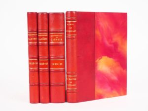 MONTHERLANT (H. de). CARNETS XXII à XXVIII – XXIX à XXXV – XLII et XLIII [3 vol.]. P., La Table Ronde, 1947-55. Trois volumes in-8 ½ chagrin rouge, dos à nerfs, titre doré, 1er plat de la couverture conservé (Reliure de l’époque). ÉDITION ORIGINALE. 2 PORTRAITS. Tirage limité et numéroté. E.A.S. sur le 1er volume : « à mademoiselle Marthe Jourdan, hommage, Montherlant » – LE MAÎTRE DE SANTIAGO. Trois actes. Illustrations couleurs d’après les maquettes de Mariano ANDREU. P., Plon, 1950. Reliure identique. Tirage limité et numéroté. ENSEMBLE DE 4 OUVRAGES.