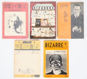 [REVUE]. BIZARRE. Cinq volumes grand in-8 brochés. - N°1. BIZARRE. (1955) - N°3. BIZARRE. (1955) - N°24-25. Cinéma fantastique. L’ÉPOUVANTE. (1962). E.A.S. : « A Monsieur Ado Kyrou / avec sympathie / Jean Claude Romer ». - N°36-37. Humour. DESSIN 64. (1964) - N°39-40. ARNAUD (Noël). LES VIES PARALLÈLES DE BORIS VIAN. (1966)