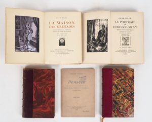 WILDE (O.). ENSEMBLE DE 5 OUVRAGES. - DE PROFUNDIS. Mercure de France, 1905. Mention fictive de « Quatrième édition ». Reliure ½ maroquin époque, plats de couverture conservés. - DE PROFUNDIS. Suivi de La Ballade de la Geôle de Reading. Mercure de France, 1921. Mention fictive de « 23e édition ». Reliure ½ basane marron foncé époque, plats de couverture conservés. Dos éclairci, épidermures. - PENSÉES. Éd. du Temps Présent, [1912]. - LA MAISON DES GRENADES. Jonquières, 1924. Bois coloriés de C. Le Breton. Un des 1100 vélin de Rives num. - LE PORTRAIT DE DORIAN GRAY. Stock, 1924. Frontispice par André Hofer. Un des 1600 pur fil num.