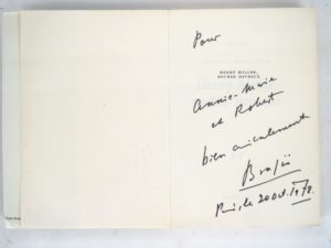 BRASSAÏ. HENRY MILLER ROCHER HEUREUX. P., Gallimard, 1975. In-8 broché, jaquette papier illustrée. ÉDITION ORIGINALE illustrée de photographies en noir et blanc. E.A.S. sur le faux-titre : « Pour Anne-Marie et Robert / bien amicalement / Brassaï / Paris, le 20 oct. 1978 ».