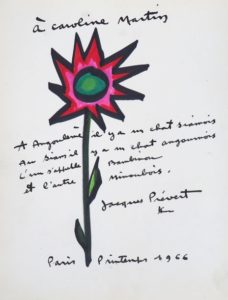 PRÉVERT (Jacques). LE PETIT LION. Photographies par Ylla. P., Arts et Métiers Graphiques, 1958. In-4 cartonné, jaquette papier à rabats illustrée. ÉDITION ORIGINALE ILLUSTRÉE de photographies en noir et blanc d’YLLA. MAGNIFIQUE E.A.S. de l’auteur à pleine page en regard de la page de titre, agrémenté d’un DESSIN COULEURS (fleur) : « à Caroline Martin / A Angoulème il y a un chat siamois / Au Siam il y a un chat angoumois / L’un s’appelle Bambinou / et l’autre Minoubois, Jacques Prévert / Paris Printemps 1966 ». L’ouvrage a été envoyé par la poste sous enveloppe kraft (cachet de la poste et timbre) qui a été conservée en parfait état : au verso Prévert a cachetée l’enveloppe avec 3 chromos de fleurs et oiseau.