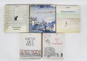 [SEMPÉ]. ENSEMBLE DE 5 ALBUMS ILLUSTRÉS par Jean-Jacques SEMPÉ. 5 volumes in-4 reliure toile éditeur, jaquette papier illustrée. - Tout se complique. Denoël, 1964. - Sauve qui peut. Denoël, 1964. - Des hauts et des bas. Denoël, 1971. - Insondables mystères. Denoël, 1994. - Grands rêves. 1997.