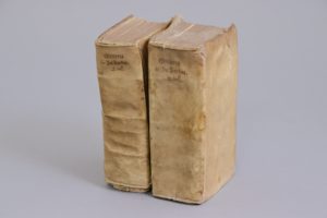 la Seconde Sepmaine. [A la suiet :] Les Trophées , ou première partie du quatrième jour de la Sepmaine.. Rouen, Thomas Mallard. 1598 3 ouvrages en 1 fort volume in-12. 684 pages ; 22 pages et (7 ff) ; 112 pages. Vélin souple du temps. (Galerie de ver dans la marge supérieure de la table du deuxième ouvrage, et dans la marge supérieure des 20 premiers feuillets du troisième ouvrage, dans les deux cas sans atteinte au texte). Edition rouennaise peu courante, reprenant l'Argument de SGS (Simon Goulard, de Senlis) et les pièces liminaires de Jean Dorat, Fédéric Morel et Robert Estienne. Agréable exemplaire.. JOINT : Les Oeuvres de Guillaume de Saluste, Seigneur du Bartas. Reveues et augmentées par l'auteur. Paris, Pierre Huet, 1583 Fort in-12. (12 ff), (1 f dépliant), 415 ff et (1 f) pour le privilège ; + table incomplète (NN 12- OO 4). Vélin souple du temps. (Traces de moisissures à partir du feuillet 380, très marquée sur les feuillets de la Table ou Indice) Petit bois gravé au début de chaque jour de la Semaine.