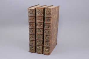 voces... Auctore Carolo du Fresne, domino du Cange... Lutetiae Parisiorum, typis Gabrielis Martini. Prostat apud L. Billaine. . Paris, Billaine. 1678. 3 volumes in-folio. (4 feuillets) dont le frontispice, CXCVIII colonnes, 1372 colonnes ; (2ff), 824 colonnes et 808 colonnes ; (2ff) et 1560 colonnes ; (2ff), 11 eaux-fortes à pleine page, et 72 pages pour la De Imperatorum Constantinopolitanorum ... numismatibus dissertatio. Plein veau du temps, dos très ornés. (Quelques défauts aux reliures : légères épidermures, coiffes endommagées, défauts bénins aux mors et aux coins.). Bon exemplaire, dans des reliures solides et agréables malgré les défauts signalés, imprimé sur un papier bien blanc, de l'édition originale de cet ouvrage considérable sur la langue latine du Moyen-Age. Cette édition de 1688 fonde la lexicologie médiévale, donnant la définition de 140 000 mots tirés de plus de 5000 auteurs de la basse latinité, et proposant au monde savant une nouvelle perception du Moyen-Age. "Immense recueil où, sous un titre modeste, il a élevé l'un des monuments les plus remarquables et les plus fameux de l'érudition du Grand Siècle. " (Grand Dictionnaire Universel du XIXème siècle, article Du Cange.) (Brunet, II, 851.). Ex-libris gravé vers 1700 : J.B. de S. Port, accompagné de quelques notes manuscrites de classement. Jean-Baptiste Gluck (1674-1748) baron de de Saint-Port, magistrat, industriel, mécène et collectionneur, avait installé sa bibliothèque et ses objets d’art dans son Château de Saint Assise, qui avait été construit pour Lefebvre de Caumartin non loin de Melun.