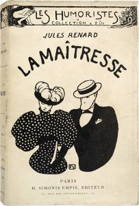 – La Lanterne sourde. Paris, Ollendorff, 1893. Petit in-12, broché. Envoi autographe signé à Jean Richepin, cette petite carte de visite d'un ami de l'aimé. Jules Renard. 3 juin 1893. – Le Vigneron dans sa vigne. Paris, Mercure de France, 1894. In-18, broché. – La Bigote. Paris, Ollendorff, 1910. Petit in-8, broché. – Bucoliques. Paris, Ollendorff, 1898. In-12, broché. On y joint un envoi autographe de l'auteur sur une feuille in-12. – Sourires pincés. Paris, Alphonse Lemerre, 1890. In-12, bradel demi-percaline verte de l'époque. Envoi autographe signé. – Mots d'écrit. Nevers, Publication des Cahiers nivernais, 1908. In-12 carré, broché. – Causeries. Nevers, Cahiers nivernais et du Centre, 1910. In-12 carré, broché. – Le Pain de ménage. Paris, Ollendorff, 1899. In-12 carré, broché. – Le Pain de ménage. Paris, Ollendorff, 1899. Petit in-8 carré, demi-maroquin brun clair, non rogné, couverture et dos (Reliure de l'époque). Un des 20 exemplaires sur hollande, après seulement 2 japons. – L'Écornifleur. Paris, Ollendorff, 1892. In-12, demi-peau de truie lilas avec coins, tête dorée, non rogné, couverture (Reliure moderne). – Nos frères farouches. Ragotte. Paris, Fayard, s.d. In-12, cartonnage, jaquette (Reliure de l'éditeur). Envoi autographe signé. – La Maîtresse. Paris, H. Simonis Empis, 1896. In-12, broché. Illustrations de Félix Vallotton. – Coquecigrues. Paris, Ollendorff, 1893. In-12, broché.