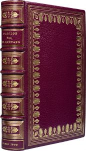 dorés en encadrement, dos orné de même, coiffes guillochées, filets sur les coupes, tranches dorées sur témoins, doublures de maroquin lavallière ornées d'une bordure dorée, gardes de tabis chocolat, doubles gardes, couverture et dos, chemise demi-maroquin et étui bordé (G. Mercier, succ. de son père).