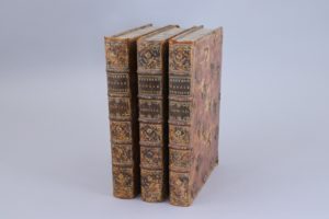 Lediard... Lyon, Les frères Duplain. 1751 3 volumes in-4°. Faux-titre, frontispice, titre, LXXVIII pages, (1 f), 668 pages. (2 ff), 707 pages ; (2 ff), 748 pages. Veau raciné du temps, triple filet d'encadrement, dos orné. (Quelques desquamations.. Coins émoussés).. Relations détaillées des combats navals, des expéditions maritimes et de grands voyages d'exploration des Anglais. (Pollak, 5580)