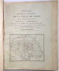 C[itoy]ens Bartholomé et Mathieu. À Paris, chez l'auteur, An IV. Grand in-folio rel. ½ basane. Cet important et rare atlas est composé de 69 feuilles gravées en taille douce et montées sur onglet (sur un total de 72 pl., mque pl. 5, 13 et 22) et d'une demi-feuille (détachée) portant le titre Atlas du Plan général de la Ville de Paris et représentant le tableau d'assemblage. La planche 70 offre le plan des opérations de trigonométrie menées sur Paris. La planche 16 comporte le titre général, qui mentionne l'ouvrage « parachevé en 1791 ». La liste des noms des rues occupe tout ou partie des planches 49, 50, 57, 58, 59, 66 et 67. Exemplaire tiré sur des papiers vergés variés, certaines feuilles azurées ; la plupart des marges ont été conservées. Bel exemplaire (qqs petites déchirures et petits mques marginaux, rousseurs éparses) L'architecte Edme Verniquet commence, dès 1775 et à ses frais, les relevés nécessaires pour établir un plan des rues de Paris. De privé, le projet devient public ; il emploiera jusqu'à 60 ingénieurs et plus de 80 aides pour les opérations de relevé trigonométrique. A la fin du 18e siècle, le plan de Verniquet est le seul qui offre une vue mathématiquement exacte de la capitale. C'est le premier plan géométral de Paris fondé sur des calculs trigonométriques et le premier à représenter fidèlement le tracé des « rues, places publiques, marchés, quais et culs-de-sac » et les plans des édifices publics ou privés. Ce plan servit de fond topographique à la plupart des plans du 19e siècle.