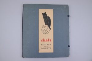 de portraits de chats, si chers à Colette - Un des 25 exemplaires de luxe, numéroté XVI, sur Japon Impérial, avec envoi à Colette.. Cet ouvrage est composé de 6 feuilles in plano 530 X 930 MM°, pliées en 2, soit 6 cahiers de 4 pages. La première page du premier cahier porte le titre, illustré d'une vignette en noir, le verso est blanc ; sur la 3ème page, grande encre de Chine rehaussée à la gouache représentant un chat langoureusement endormi, signée Jacques Nam, avec envoi à Colette ; au verso figure le tirage : 5 exemplaires de "grand luxe" sur Japon Impérial (N°s I à V, avec double état des eaux-fortes), 25 exemplaires de "luxe" (N°VI à XXX) avec croquis originaux dans les marges des planches, 350 exemplaires sur vélin d'Arches (N°1 à 350) et 20 exemplaires Hors Commerce marqués de A à T. Sur la première page des 5 cahiers suivants, figure le texte de Colette, enrichi en tout de 9 croquis de chats, à l'encre de Chine rehaussée à la gouache et à l'aquarelle. Les 3 autres pages sont blanches. Au milieu de chaque cahier est insérée une grande eau-forte en couleurs de Jacques Nam. Sans doute le plus désirable des exemplaires de cet ouvrage, qui passe pour un des plus beaux livres animaliers du XXème siècle : il a été offert à Colette par Jacques Nam, deux ans après la publication d'un des plus beaux romans de l'écrivaine, "La chatte".Il porte cet envoi sur la 3ème page : :"A Colette, qui a donné à mes Chats plus que la vie ... une âme. Avec mes sentiments amicaux. Jacques Nam". Sont joints le prospectus d'annonce de la publication (roussi) et un tirage à part de la grande étiquette de titre.