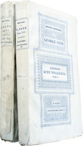 Édition originale d'un des ouvrages les plus rares et les plus estimés de l'auteur. Mention fictive de seconde édition sur les titres et les couvertures — qui constituerait paradoxalement une remarque de premier tirage selon une intéressante notice autographe de Jules Le Roy jointe à l'exemplaire. Bel exemplaire broché, tel que paru, comportant comme il se doit les six vers de Musset en tête du second tome. Les volumes sont conservés sous chemises et étui de papier marbré confectionnés par Lavaux. On y joint trois extraits de la Revue des Deux Mondes, contenant l'article critique de Gustave Planche sur Lélia paru en juillet 1833 et les fragments inédits de l'ouvrage intitulés Les Morts et Contemplation donnés à la revue en juillet et octobre 1836 (déreliés), ainsi qu'un portrait de l'auteur lithographié chez Aubert provenant de la Galerie de la Presse (volant). De la bibliothèque Jules et Léon Le Roy, sans marque de provenance.