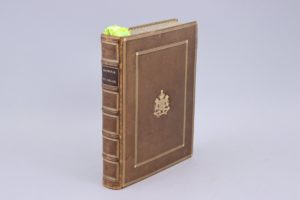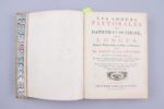 tableaux inventés et peints de la main de ce grand Prince .... Paris, Imprimées pour les Curieux. 1757 Petit in-4°, frontispice de Coypel, VIII et 269 pages ; 29 planches gravées hors-texte. Plein veau de couleur olivâtre, double encadrement de trois filets dorés, encadrement de 4 filets à froid avec fleurons à froid ; armes poussées au centre des plats de la famille d'Aligre, avec la devise Non uno gens splendida sole ("Une race qui ne brille pas que d'un seul soleil").. Dos orné à froid dans les caissons, avec encadrement de filets dorés. Reliure établie vers 1860. Impression sur vergé fort., sans aucune rousseur. Première édition de ce format. Encadrement typographique à chaque page. L’illustration comprend 1 frontispice de Coypel, les 29 planches du Régent retouchées et entourées de magnifiques cadres avec sujets divers, 1 fleuron de titre, 8 grandes vignettes en-tête et 8 culs-de-lampe par Cochin, le tout gravé par Audran et Fokke. La figure des “petits pieds”, est placée page 162. (Cohen 653). Le blason se lit comme suit "Burelé d'or et d'azur de dix pièces, au chef du second, chargé de trois soleil du premier" Deux extravagants ex-libris manuscrits à pleine page, d'une parfaite immodestie, au verso de la garde volante et sur la première garde blanche : "Mon. le Marquis d'Aligre au château des Vaux". Il s'agit du 7ème et dernier Marquis d'Aligre, qui, pour embellir (encore) son énorme château des Vaux, fit détourner le cours de l'Eure. Richissime, il mourut sans descendant en 1889. La marquise resta quelques années au château, et vendit peu à peu ses 25000 hectares, et ses collections. Le château fut acquis en 1946 par la Fondation d'Auteuil "pour le prix de deux timbres-poste".