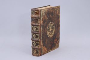 Poitiers au centre des plats, toutes tranches dorées. Parfait état intérieur(Reliure tavelée).. Ex-praemio manuscrit en latin sur la 2ème garde volante. "Ce livre a été remis en prix le 29 août 1688 par le Directeur du Collège des Jésuites de Poitiers, par la générosité de Nicolas Joseph Foucault". Nicolas Joseph Foucault (1643-1721) fut intendant de la Généralité de Poitiers de 1685 à 1689. Il imposa avec une grande brutalité le nouvel ordre religieux, après la Révocation de l'Edit de Nantes du 18 octobre 1685. Ce bibliophile averti et catholique intransigeant ignorait, semble-t-il, que l'imprimeur du livre qu’il remettait en prix, l'excellent Christian Egenolph (1502-1555), protestant convaincu, avait été un ami de Melanchton, et qu'il avait publié des textes d'Ulrich von Hutten et Erasme placés en bonne place à l'index.