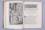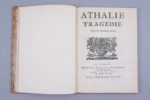 Godillot. (Le frontispice manque. Charnière frottées). Edition originale de la dernière pièce de Racine. Le Privilège accordé à Racine le 11 décembre 1690 est cédé par lui à Denys Thierry et Claude Barbin. Achevé d'imprimer le 3 mars 1691. Commandée par Louis XIV pour la Maison Royale de Saint Louis, Athalie fut jouée par les charmantes pensionnaires de l'école devant quelques très rares spectateurs choisis, parmi lesquels le Roi, le Dauphin, Mme de Maintenon et Fénelon. Pour éviter qu’une promiscuité dangereuse s’installât entre les jeunes filles de la Maison Royale et la horde des courtisans, comme ce fut le cas en 1689 lors de la représentation d’Esther, ce n'est qu'en 1716 que la pièce fut proposée au public. Exemplaire à belles marges (250 X 185 mm) (Tchemerzine, IX, page 350)