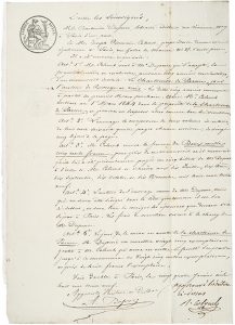 Exceptionnelle réunion des deux chefs-d’œuvre de Stendhal accompagnés des contrats d’édition originaux de l’auteur, pièces extrêmement précieuses et uniques. I. Le Rouge et le Noir : Édition originale, très rare et extrêmement recherchée. Manifestement imprimée à 750 exemplaires, cette première édition ne connut pas de tirage en grand papier. Elle est ornée sur le titre de chaque volume d’une vignette d’Henry Monnier reprise sur la couverture. Très bel exemplaire à toutes marges, avec témoins, bien complet de l’avis de l’éditeur, de la note de l’auteur et des plats de couverture. Cité par Carteret dans le Trésor du bibliophile et par Cordier dans la Bibliographie stendhalienne, l’exemplaire a été finement relié par Émile Mercier à l’orée du XXe siècle. Précieuse provenance stendhalienne : l’exemplaire a figuré dans la collection Legrand (1912, I, n°1027), qui avait fait établir tous ses Stendhal par Mercier du même maroquin rouge décoré de fers romantique ; puis dans celle du marquis de Piolenc (1913, n°524), dont les éditions originales de Stendhal, acquises pour la plupart lors de la vente Legrand, avaient été enrichies par ses soins d’autographes parmi les plus précieux, tel celui-ci ; et enfin dans la bibliothèque du marquis Du Bourg de Bozas (1990, I, n°260), héritier de Gustave Chaix d’Est-Ange, avec ex-libris. L’ouvrage est enrichi par l’exemplaire de Stendhal du contrat d’édition du Rouge et le Noir, passé avec Alphonse Levavasseur le 8 avril 1830. Ce précieux document manuscrit, copié sur la première page d’un feuillet in-4 replié et monté sur onglet en tête du premier volume, détaille avec précision les conditions de l’édition du roman d’Henri Beyle, qui ne porte pas encore pour titre Le Rouge et le Noir mais Julien, avant d’être rebaptisé au mois de mai 1830. Stendhal avait repris la première version de son manuscrit, jugée trop courte, en janvier 1830 et n’avait alors achevé que la première partie du roman. Il dut en rédiger la seconde dans la hâte pendant qu’on imprimait la première. Les deux volumes parurent le 13 novembre 1830, sous le millésime de 1831, avec ce sous-titre trop souvent oublié : Chronique de 1830. Par ce contrat, Stendhal vend à Levavasseur « le droit d’imprimer et de publier son roman intitulé Julien ou autrement, à quinze cents exemplaires avec leur main de passe ». Suivent le détail du tirage prévu, en deux éditions, in-8 et in-12, de 750 exemplaires chacune, et les modalités de paiement du manuscrit : vendu 1500 francs par l’auteur, il devra être remis à l’éditeur « vers la fin du présent mois d’avril », délai qui ne sera pas respecté. Enfin, « M. Levavasseur s’oblige à en remettre vingt-cinq exemplaires gratis à l’auteur. Le titre sera Julien, par M. de Stendhal. », etc. Revêtu des signatures autographes d’Henri Beyle et d’Alphonse Levavasseur, le document comporte plusieurs ajouts et corrections de la main de l’écrivain : « Henri Beyle, propriétaire rue Richelieu n°71 » et « Julien ou autrement », ajoutés dans des blancs ménagés par le scripteur ; deux lignes biffées et remaniées concernant le règlement de ses droits par billets à échéance : « remise du manuscrit [...] cinq cents francs en un billet à trois mois et cinq cents francs en un billet à six mois » ; mais surtout, la phrase centrale : « Le titre sera Julien, par M. de Stendhal » ; et, à la fin du document, les mentions « Approuvé l’écriture » et « Approuvé douze mots rayés nuls ». Stendhal a de plus titré le document sur le revers du pli, en marge du second feuillet, en y inscrivant à la plume : « Julien, marché : 1 500 f. en 3 payements 8 Avril 1830 », et encore : « Marché Julien » (voir la reproduction en première de couverture). Provenant des archives de l’écrivain qui furent léguées à sa mort à son cousin, ami et exécuteur testamentaire Romain Colomb, par qui il fut pieusement conservé et légué à sa fille Claire du Bos de Chavanon, ce contrat d’édition du Rouge et le Noir passa ensuite entre les mains d’Auguste Cordier, qui le fit imprimer en 1900 dans son ouvrage Comment a vécu Stendhal, avant d’échoir à Casimir Stryienski. La version établie par Vittorio Del Litto en 1999 dans la Correspondance générale n’a pu être établie que d’après l’ouvrage d’Auguste Cordier. II. La Chartreuse de Parme : Édition originale, très rare et tout aussi recherchée. Elle n’a pas connu de tirage en grand papier. La Chartreuse de Parme, écrivait Balzac dans la Revue parisienne, est dans notre époque et jusqu’à présent, à nos yeux, le chef-d’œuvre de la littérature d’idées... M. Beyle a fait un livre où le sublime éclate de chapitre en chapitre. Il a produit [...] une œuvre qui ne peut être appréciée que par les âmes et par les gens vraiment supérieurs. Très bel exemplaire à toutes marges, avec témoins, lavé, encollé et parfaitement établi avec les couvertures au complet. Georges Mercier l’a revêtu en 1913 d’une fine reliure dont le décor, inspiré des créations romantiques, a été réalisé avec les fers de son père, à l’identique du Rouge et le Noir relié pour E.-C.-A. Legrand. De la bibliothèque du marquis Emmanuel du Bourg de Bozas (1990, I, n°262). L’ouvrage est également accompagné de l’exemplaire de Stendhal du contrat d’édition de la Chartreuse de Parme, passé le 24 janvier 1839 entre Ambroise Dupont et Romain Colomb, mandaté par Stendhal pour défendre ses intérêts éditoriaux dans cette tractation où il ne souhaitait pas voir son nom cité, se trouvant dans l’impossibilité, « sous peine de perdre sa place, de livrer son nom à la notoriété publique » (Vittorio Del Litto). Ayant commencé à écrire La Chartreuse de Parme le 4 novembre 1838, à Paris, « at Caumartin street », Stendhal en adressa cinquante-d
