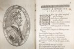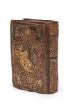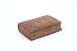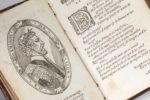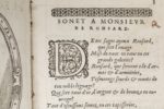 le privilège. Reliure du temps, peut-être lyonnaise, en veau rouge, 5 filets d'encadrement dont 2 à la cire noire, écoinçons azurés et large olive centrale ornés en plein de rinceaux à l'or et à la cire noire, sur semé de petits fleurons ; filet sur les coupes ; dos grecqué orné de motifs dorés curvilignes. Tranches ciselées et dorées. Exemplaire réglé. (Gardes changées en début d'ouvrage ; quelques usures et manques de cire noire. La mention "tome quatrième" du titre a été stupidement grattée.). Très intéressante reliure du temps (à rapprocher du N°68, planche 8, du Catalogue Damascène Morgand, 1910 : Heures de Nostre Dame, Paris, Kerver, 1568). Tome IV de la quatrième édition collective des Oeuvres de Pierre de Ronsard, publiée en 1572 pour le tome I et 1573 pour les autres tomes. Elle se compose de 6 tomes in-16, plus La Franciade correspondant à un tome VII). Elle succède aux éditions des Oeuvres de 1560 dont elle conserve le privilège (4 tomes in-16), de 1567 (6 tomes in-4°) et de 1571 (6 tomes in-16). Toutes ces éditions sont publiées chez Gabriel Buon. (Barbier-Mueller, volume Ronsard, n°53 page 170