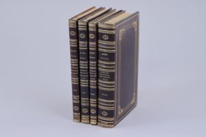 Imprimeur du Musée Royal. 1838-1844 4 volumes in-12 . Plein maroquin aubergine à grains longs. Triple encadrement doré sur les plats ; dos sans nerf orné. Toutes tranches dorées. Reliures du temps signées Ginain.. (Quelques feuillets froissés dans le volume de 1838) Depuis sa création en 1795, et jusqu'à 1848, le Salon des Artistes Français s'est tenu au Louvre. Ces 4 catalogues présentent, et commentent souvent, près de 8000 oeuvres exposées, principalement en peinture. Les commandes officielles sont mentionnées, les adresses des artistes sont indiquées. Très bel ensemble dans une élégante reliure de Ginain, relieur-doreur actif de 1821 à 1847.