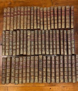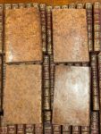 (Masfaure 1747- Azay-le Rideau 1824), . Reliures parfaitement homogènes excepté le tome 10 qui na pas l'ex-libris, et présente des fers légèrement différents ; dans 9 des 19 premiers tomes, le fer du caisson de queue (rameau de chêne) est remplacé par un blason à trois fleurs-de-lys surmonté d'une couronne. Très bel exemplaire, pratiquement exempt de défauts. • Intéressante collection de toutes les œuvres de Voltaire réunies par un noble éclairé. La date ultime des 59 volumes de la collection Biencourt est celle qui figure sur le titre de la XIXème partie des Nouveaux Mélanges Philosophiques : 1776. soit un an avant la tentative avortée de Panckoucke, (1777), et 9 ans avant l’édition de Kehl (1785) sous la direction de Beaumarchais.. Page de la Reine en 1761, colonel d’infanterie et commandant en second du régiment de Champagne (1773) et du Berry (1776), Chevalier de Saint Louis (1779), Charles de Biencourt (Ahun 1747- Château d’Azay le Rideau 1824), est promu Maréchal de Camp en 1788. Député de la noblesse aux Etats Généraux de 1789, mais sensible aux idées des Lumières, comme le montre cette réunion des œuvres de Voltaire, il est l’un des premiers de son ordre à voter les décrets de l’Assemblée Nationale Constituante, et à rejoindre le Tiers Etat. Ses prises de position hardies ne l’empêchent pas d’acquérir le château d’Azay le Rideau en 1791 pour la somme considérable de 300000 livres. Biencourt prend comme base la première édition des œuvres de Voltaire publiées chez Gabriel Cramer à Genève en 1756 en 17 volumes. Il continue sa collection en ajoutant –ou plutôt en insérant –les titres manquant à la première édition Cramer, sans tenir compte de la chronologie des publications, mais plutôt de la logique des textes, et en donnant aux volumes une tomaison continue : -ce qui fait, par exemple, que très logiquement le tome XVII de 1756 porte ici au dos la pièce de tomaison XXI. Le projet de Beaumarchais de publier les œuvres complètes de Voltaire, qui paraitront à Kehl à partir de 1785, était connu dès 1779. Il est probable que c’est entre ces deux dates que Biencourt a fait relier sa collection, la considérant soit comme aboutie – soit comme bientôt dépassée.. Cette collection, dans laquelle figurent plusieurs éditions originales, est constituée de la manière suivante : 1)-Les 17 volumes de la Collection complette de M. de Voltaire. Première édition. (Cramer, Genève), 1756. (Collation conforme à Bengesco 2133) 2)- Collection complette des Oeuvres de M. de .... Dernière édition. (Cramer, Genève), 1764 . Tome cinquième, seconde partie : Seconde suite des Mélanges de littérature, d'histoire, de philosophie, etc.... (BnC 89, col.77). 424 pages. Semble contenir une pièce de plus que l'édition Cramer de 1761 (BnC 79 à 83). « Lettre de M. Eratou à M. Clockpicre, aumônier de S.A. S.M. le Landgrave ».). Ce tome, placé entre les tomes V et VI de l'édition de 1756, est la suite logique du tome V de l'édition Cramer de 1756. Ce volume semble manquer à la B.N. à cette date. 3) -Collection complette des Oeuvres de M. de .... Dernière édition. Tome cinquième, troisième partie. 1764. Contes de Guillaume Vadé. (BnC, 2071 :"Réédition de la princeps avec additions"). Placé entre les tomes V et VI de l'édition de 1756, à la suite du volume précédent.. 4) -Collection complette des Oeuvres de M. de Voltaire. Dernière édition. Tome dixième, seconde partie. 1764. Ouvrages dramatiques avec les pièces relatives à chacun, tome cinquième. (BnC, 90, col. 77). Placé entre les tomes X et XI de l'édition de 1756. 5) Ouvrages dramatiques avec les pièces relatives à chacun. 1756. Tomes premier à cinquième. (Tomes VII à X, seconde partie, de la première édition des Oeuvres Complètes). Tomés 9 à 13 au dos 6) Essay sur l'histoire générale et sur les moeurs et l'esprit des nations. Tomes premier à septième. 1756 (Tomes XI à XVII de la première édition des Oeuvres Complètes). Tomés 14 à 20 au dos. ; pièces de titre : "Histoire Générale, I à VII". 7) -Supplément à l'édition de l'Essay sur l'histoire générale (...) imprimée en 1756. 1763. (BnC 3075 ; Bengesco, n°1164). Sans errata. Tomé XXI au dos ; pièce de titre : "Histoire Générale, VIII". 8) - Siècle de Louis XIV. Tomes I (VIII et 399 pages) ; II (VIII et 399 pages) ; III (VIII et 368 pages) ; IV (VIII et 366 pages).... A Genève 1771. S'agit-il, à la fausse adresse de Genève, de l'édition Grasset à Lausanne, publiée à partir de 1770? Semble manquer à la BN (Voir BnC 149). Pièces de tomaison XXII à XXV. Forment les tomes VII, VIII, IX et X de l'Essai sur les moeurs et l'esprit des nations