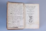 Bel ex-libris gravé fin XVIIème au verso du titre de Nicolaus de La Place Sancto Stephano Abbas, avec devise grecque.
