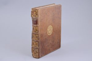 Plein veau fauve moucheté, triple filet d'encadrement, armes royales au centre des plats. Roulette sur les coupes. (Mors du second plat fendu ; coiffes et coins émoussés. Large auréole de mouillure dans 1/4 de l'ouvrage.