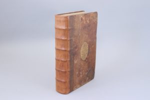 Plein veau fauve avec large olive d'arabesques au centre des plats (Epidermures sur les deux plats. Le dos a été très maladroitement refait ; les gardes ont été changées.