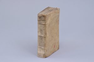 Plein vélin, traces de lacets. Reliure du temps. (Manque d'une bande de papier -sans doute pour supprimer un ex-libris- dans la marge de queue du titre, sans toucher au texte.