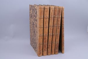 1/2 veau fauve du temps, dos ornés de fers très sobres, probables fers "de l'éditeur". (Quelques défauts aux coiffes et aux coins. Rousseurs marquées sur les feuillets de texte, rares sur les planches.