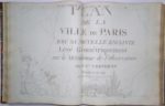 Cet important et rare atlas est composé de 69 feuilles gravées en taille douce et montées sur onglet (sur un total de 72 pl., mque pl. 5, 13 et 22) et d'une demi-feuille (détachée) portant le titre Atlas du Plan général de la Ville de Paris et représentant le tableau d'assemblage. La planche 70 offre le plan des opérations de trigonométrie menées sur Paris.