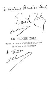 Édition originale. Envoi autographe signé d'Émile Zola à Madame Maurice Sand, la belle-fille de George Sand, née Lina Calamatta. L'exemplaire a également été dédicacé par Fernand Labori et Albert Clemenceau, les avocats de Zola et du journal l'Aurore ; le second ayant accompagné sa signature d'un envoi à Bellot, surnom intime de Lina Sand. Précieuse relique, hélas très usée : couvertures abîmées avec manques, un plat détaché, dos fendus, piqûres. Inscription biffée au feutre sur les couvertures.