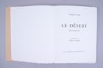 3) - LOTI, Pierre. Le désert. Fragments. Gravures de Tuvia Beeri. Les Bibliophiles de Provence, 1995. Grand in-4°, en feuilles. Couvertures rempliées, chemise et étui. Tirage total à 130 exemplaires, tous sur vélin BFK de Rives. Un des 100 exemplaires réservés aux sociétaires, celui-ci n°22 Belles eaux-fortes en couleurs de Tuvia Beeri, protégées par des serpentes de Chine.