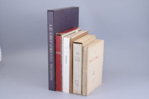 6) Balzac : Le chef-d'oeuvre inconnu. Lithographies originales de Bension Enav. Paris, Fernand Mourlot, 1977. Grand in-folio (460 X 340 mm), en feuilles, couvertures illustrées de lithographies en couleurs, chemise et étui. Tirage à 200 exemplaires, celui-ci un des 125 sur vélin d'Arches (n°120). 35 lithographies in et hors-texte de l'artiste israélien Bension Enav (1925-2007). Envoi de Bension Enav ; signatures de Bension Enav et Fernand Mourlot.