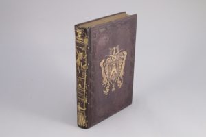 Reliure en ½ chagrin, illustrée par Grandville , larges armoiries fantaisistes sur les plats surmontées d'un bonnet de coton et encadrées d'une paire de chausses, avec la devise "Je n'en fais qu'à ma tête" : dos sans nerf orné d'une échelle (sociale) : Mme Paturot est sur le barreau inférieur de l'échelle, tandis que Jérôme Paturot accède au sommet. Toutes tranches dorées.