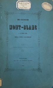 Très rare ouvrage, récit de la trente-quatrième ascension du mont Blanc, et non la vingt-huitième par le quarantième voyageur et huitième français comme l'indique l'auteur, ni la trente-deuxième comme l'indique l'étiquette collée à l'époque sur la couverture. Le récit de son expédition à l'Aiguille du Midi (première ascension par ses guides), dix ans plus tard, a été imprimé a très petit nombre et repris dans Histoire du Mont-Blanc de Stephen d'Arve.