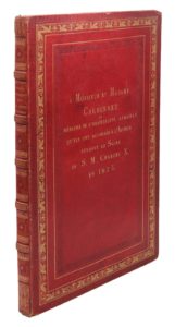 BRAY (Comte François Gabriel de) — Voyage pittoresque dans le Tyrol ; aux salines de Salzbourg et de Reichenhall et dans une partie de la Bavière. Paris, librairie de Gide Fils, 1825. In-folio, reliure plein maroquin rouge, dos à nerfs richement orné, titre doré au dos, encadrements de filets et de roulettes dorées et de motifs à froid sur les plats, roulette dorée sur les champs, tranches dorées, gardes en soie moirée verte.