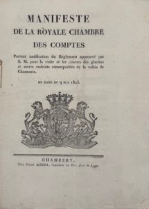 CHAMBRE ROYALE DES COMPTES — Manifeste de la Royale Chambre des Comptes portant notification du règlement approuvé par S. M. pour la visite et les courses des glaciers et autres endroits remarquables de la Vallée de Chamonix en date du 9 mai 1823. Chambéry, Pierre Albera, Imprimeur du Roi, 1823. In-4°, broché, protégé par une chemise cartonnée.